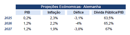 Na Alemanha, o robusto plano de despesa pública deverá impulsionar o crescimento para 1,2% em 2026 e 2027, após 0,2% em 2025, mas resultará igualmente num aumento da dívida pública (prevista subir para 67% do PIB em 2027, face a 63,5% em 2025).