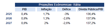 O percurso de consolidação orçamental de Itália está finalmente a dar frutos e os seus défices deverão diminuir de 3% este ano para 2,6% em 2027, originando apenas um ligeiro aumento da dívida pública (+0,8 p.p.) nesse período. Contudo, ao contrário da Alemanha, cujas políticas orçamentais irão impulsionar o crescimento, a trajetória de crescimento de Itália nos próximos três anos é menos clara, traduzindo-se em projeções de crescimento muito moderado (0,8% em 2026 e 2027).