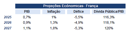 O crescimento de França nos próximos anos deverá ser apoiado por uma dinâmica interna robusta e por uma recuperação do investimento. Embora a Comissão preveja, com base no projeto de Orçamento para 2026, alguma forma de consolidação orçamental no próximo ano (ainda com um défice de 4,9% do PIB), em 2027, com a expiração de algumas medidas de reforço das receitas, o défice deverá voltar a subir para 5,3% do PIB.